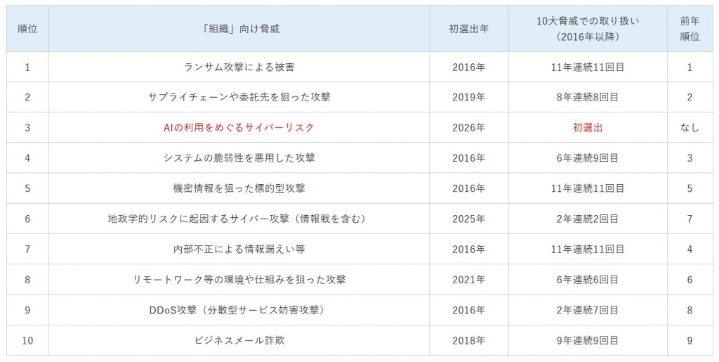 「情報セキュリティ10大脅威 2026」(https://www.ipa.go.jp/pressrelease/2025/press20260129.html)(2026年1月29日)組織向け脅威