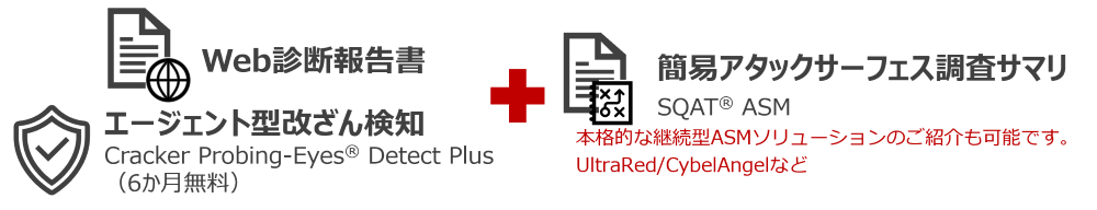 気づかぬうちにWebサイトが改ざんされている危険をいち早くキャッチするエージェント型の当社ツール「Cracker Probing-Eyes® Detect Plus」を6か月間無料でお試しいただけます。