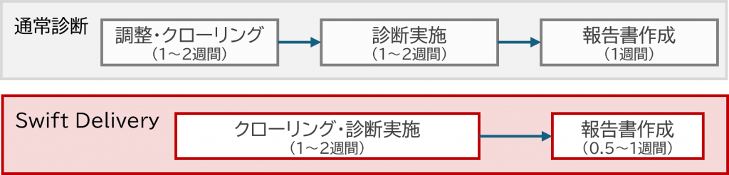 通常のWeb診断とは異なり、スピード重視のため、当社を信頼いただき、診断プロセスをお任せいただく形となります。再診断については緊急・重大レベルが検出された場合のみ無償で対応致します。(3か月以内の実施)